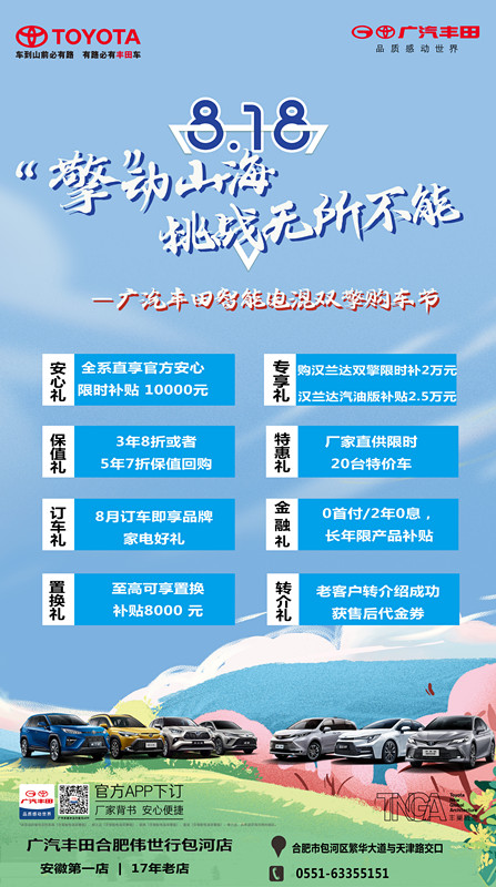 8 ┋广汽丰田818超级狂欢购1 ┋ 8月18日-8月20日8 ┋安心补贴至高10000元嗨 ┋ 八重好礼 嗨翻全场购 ┋火力全开,惠动全城VIP:400-931-7541广汽丰田合肥伟世行包河店