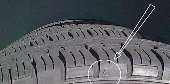 下图是磨损标记指示箭头,顺着指示标记的箭头方向,往胎面看,就可以看到花纹里的凸起的磨损标记了。