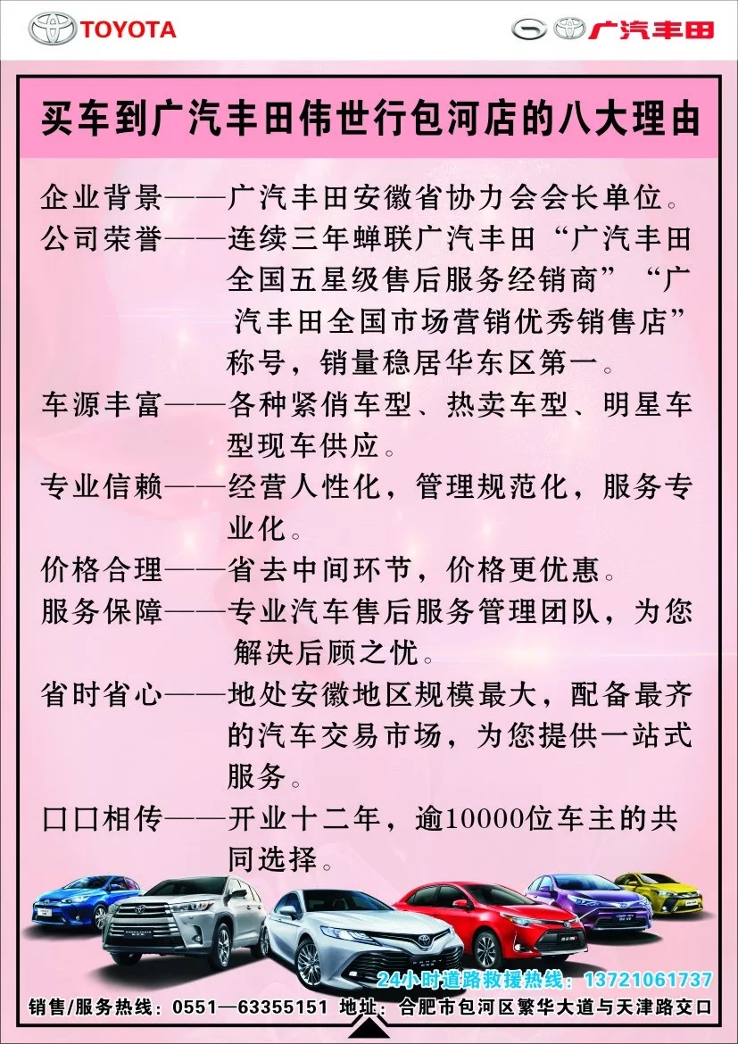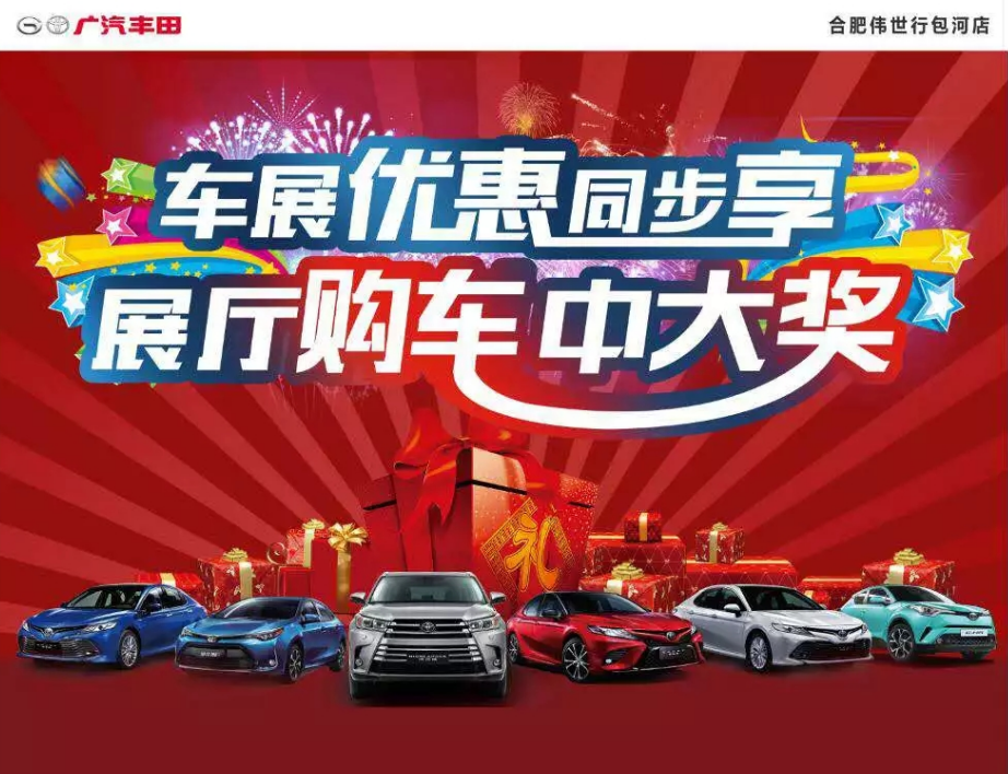 各位即将要买车的朋友们,如果您担心车展太过吵闹或者有恶劣天气,您可以直接来我们店—广汽丰田合肥伟世行包河店。这里有更加舒适的环境。