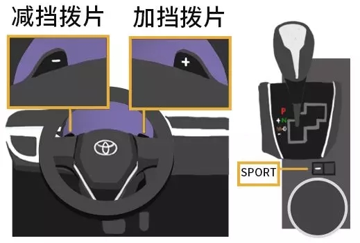 ?在操纵换挡拨片时,驾驶者-般只需将挡位推入D、S或手挡模式。按减挡拨片下部(通常左侧是减挡拨片,右侧是加挡拨片)即变为当时时速的相应挡位,再按又减一挡;按加挡拨片增加一挡,增到最高挡时松油门再给油变到D挡。