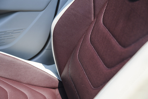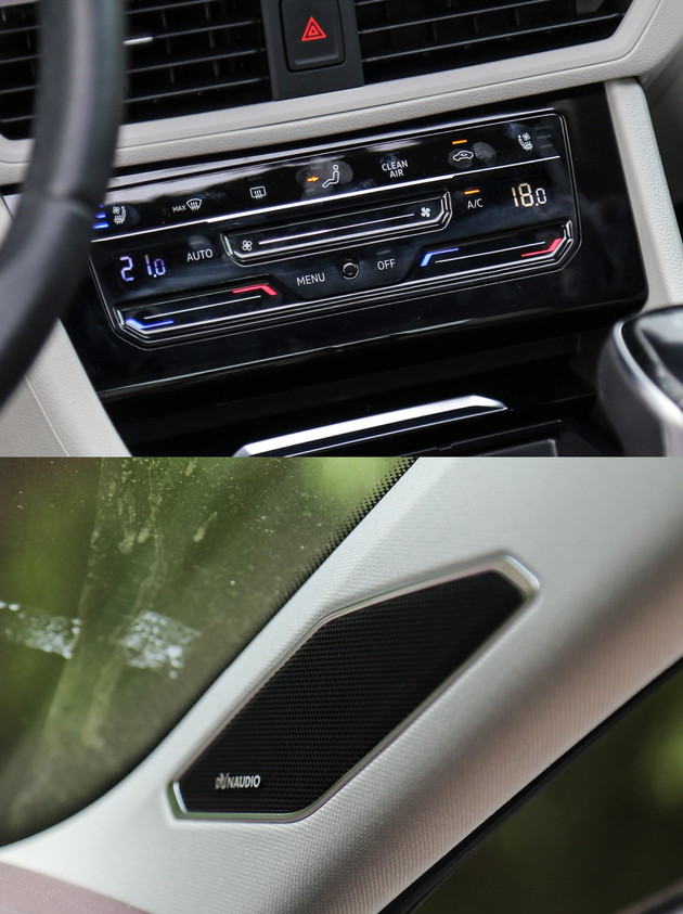 我喜欢空调控制区的设计,取消了实体按键,通过滑动或点按的方式控制风量和温度,准确度也挺高的,很好用,看着也很时尚,不过这同样出现在高配车型上,豪华版以下还是旋钮的设计,但也比较实用。这款顶配车型上还选装了丹拿音响,配置非常齐全。