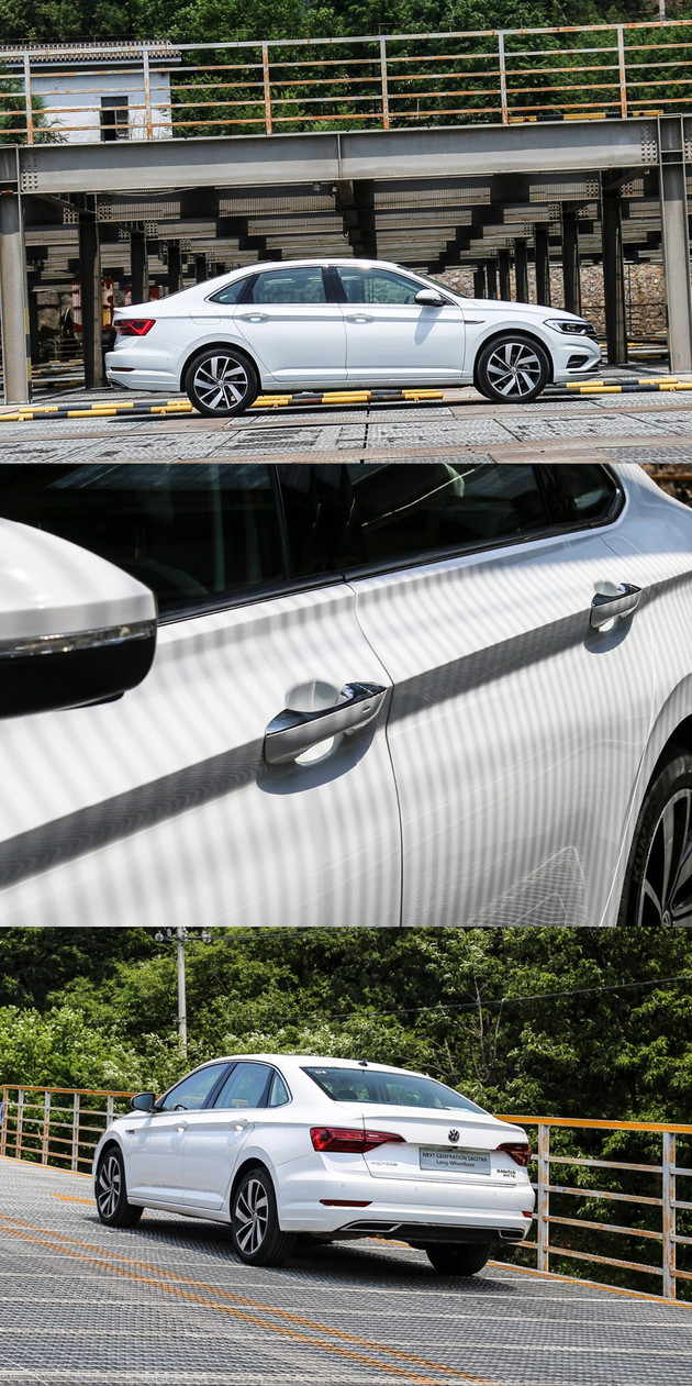 这一代速腾用上了双腰线的设计,门把手处的腰线向外凸出很大一块,这一处比较吸引我,看着层次感很丰富,并且这跟线条整体略微上扬,塑造出了一种俯冲的姿态。加长后速腾的整体尺寸已经接近一台中型车,和一般的紧凑型轿车停在一起它看着明显更大更有气势,这是很大的优势。