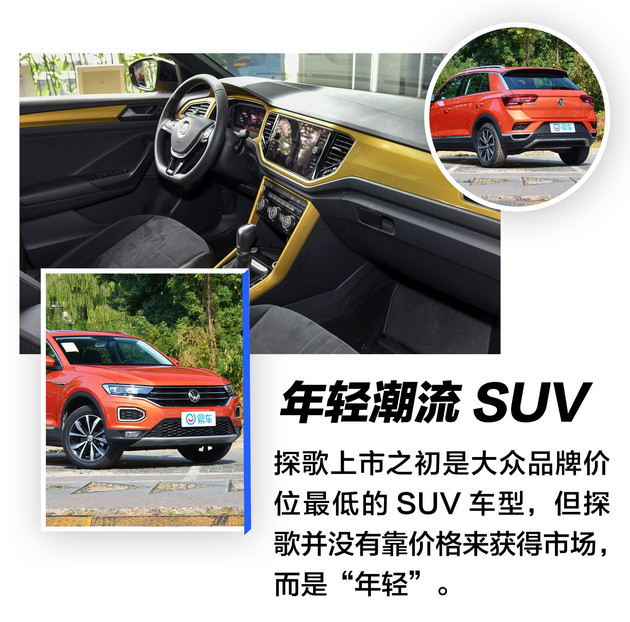 探歌在上市之初,有一个光环是“最z便z宜的大众SUV”,这对消费者还是有吸引力的,毕竟“大众”和“SUV”在国内都是热门词汇,两者之间还有“便宜”,那么探歌是不是就能行?但实际上探歌并没有靠价格来获得市场,而是“年轻”。