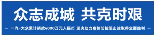 在接到成都市相关抗击疫情定点医疗防疫机构的援助申请后,一汽-大众第一时间通过抗击疫情合作公益机构中国扶贫基金会向成都市捐赠人民币500万元,驰援成都市抗击疫情工作。费用将用于支持成都市公共卫生临床医疗中心的医疗物资购买,病房改造以及防疫车辆。