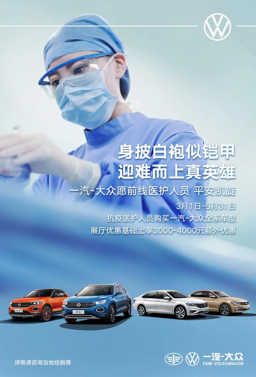 3月1日至5月31日,抗疫医护人员购一汽-大众全系车型,