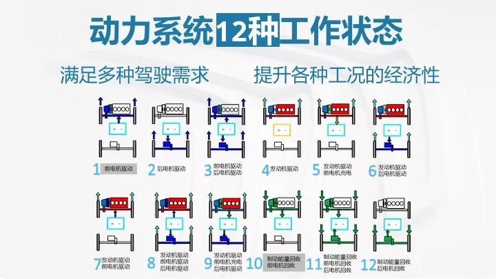 这台车没有纯粹的燃油模式,4种驾驶模式分为混动模式、纯电模式、运动模式、四驱模式,多种驾驶模式可以衍生出12种主要的工作状态。