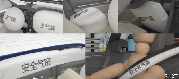 其中气袋包括正面气囊、侧面气囊,膝部气囊、安全带气囊以及安全气帘等。