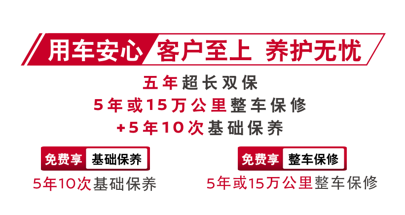 活动期间购车可享5年或15万公里超长整车保修+5年10次超安心基础保养
