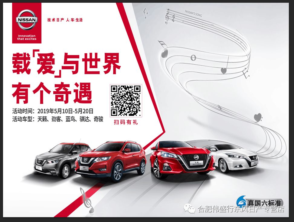 即日起至5.20日,购天籁、奇骏、劲客、蓝鸟、骐达可享空气进化器或新车应急套装。