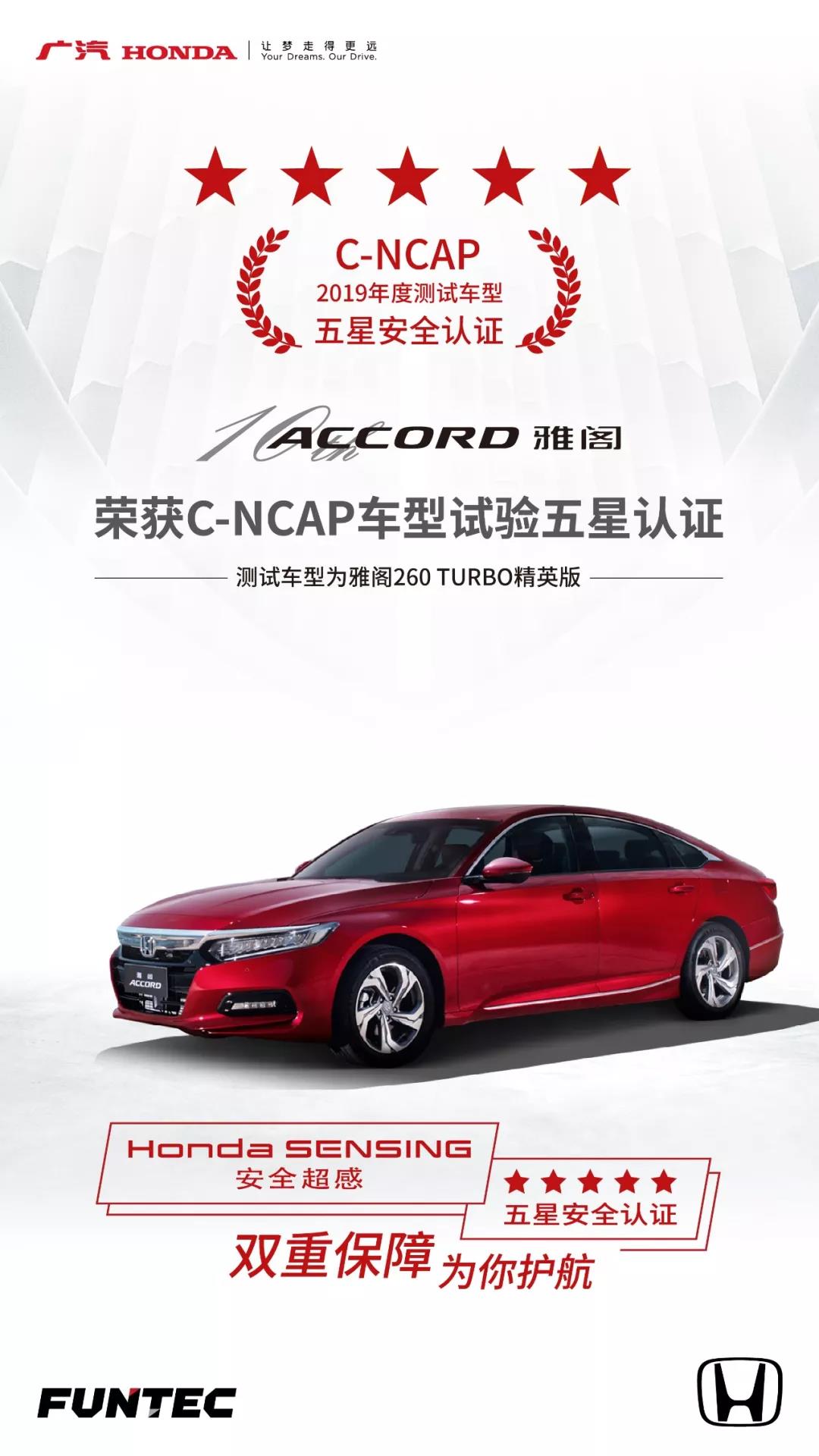 近日,2019年度第二批C-NCAP评价车型结果正式发布。其中,广汽本田第十代雅阁(ACCORD)*荣获C-NCAP 五星安全评价,再次证明雅阁(ACCORD)一如既往的高品质安全实力,树立中高级轿车安全新标杆。
