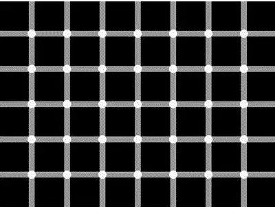 你是不是也一直感觉有黑点在跳跃?这就是著名的Hermann Grid Illusion-2 赫尔曼方格。而这种错觉叫做“熄灭错觉”。因为黑点不存在,而且并非是一直“闪烁”的。