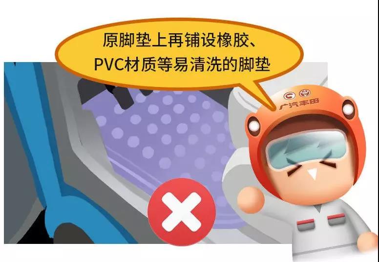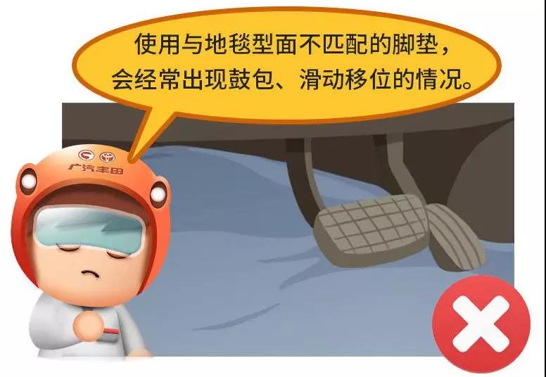 铺设脚垫时,确保脚垫不会影响油门、刹车踏板、离合器(手动挡车辆)的使用。日常用车注意自检,发现地毯偏移时及时调整地毯位置。