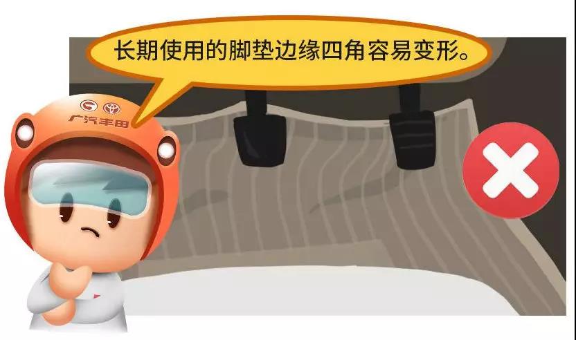 使用达到一定年限的脚垫一般都会出现四角翘起等变形的现象。边缘翘起的位置容易卡住油门或刹车,后果不堪设想!所以,车主朋友们平时多注意脚下,察觉已经变形的脚垫就要马上更换咯~二