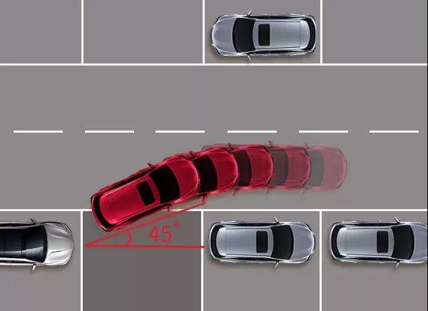 三、当车身和旁车成45度角时,方向盘往左打满继续倒车,就能将车停入车位。