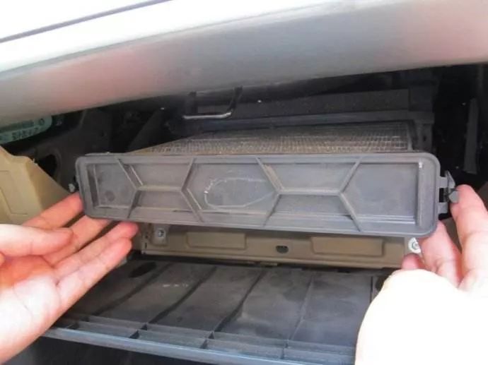 空气滤芯一般位于副驾驶位的手套箱后面,将手套箱拆卸下来,便可以取出滤芯进行检查。如果滤芯还未完全被脏物堵塞,那还可以清洁继续使用。反之,则应更换新滤芯。