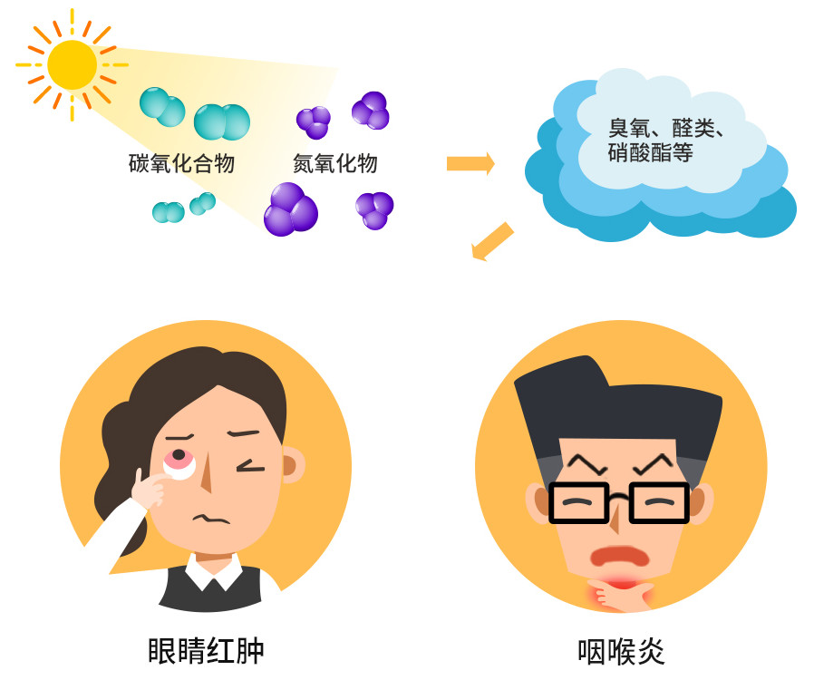当氮氧化物和碳氢化合物在太阳紫外线的作用下,会产生一种具有刺激性的浅蓝色烟雾,其中包含有臭氧、醛类、硝酸脂类等多种复杂化合物,对人体最突出的危害是刺激眼睛和上呼吸道黏膜,引起眼睛红肿和咽喉炎。