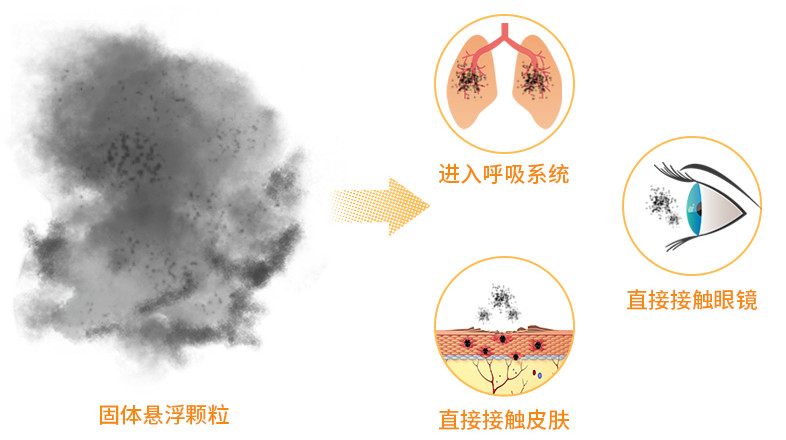 固体悬浮颗粒具有较强的吸附能力,能够随呼吸进入人体肺部,引起呼吸系统疾病,带来肿瘤隐患。它还能直接接触皮肤和眼睛,阻塞皮肤的毛囊和汗腺,引起皮肤炎和眼结膜炎,甚至造成角膜损伤。