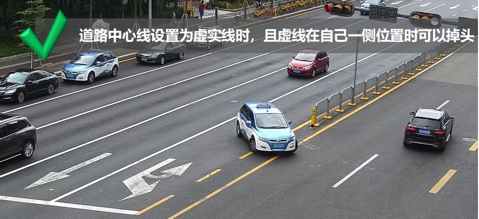 1.有掉头标志或道路中心线设置为虚实线时,可以掉头。