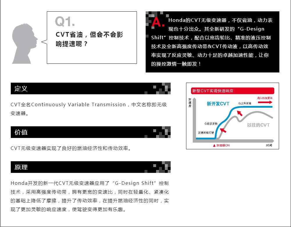 Honda的CVT无级变速器,不仅省油,动力表现也十分出众。其全新研发的“G-Design Shift”控制技术,配合以宽齿轮比、精准的液压控制技术及全新高强度传动带&CVT传动液,以高传动效率实现了反应灵敏、动力十足的卓越加速性能,让你的操控激情一触即发!