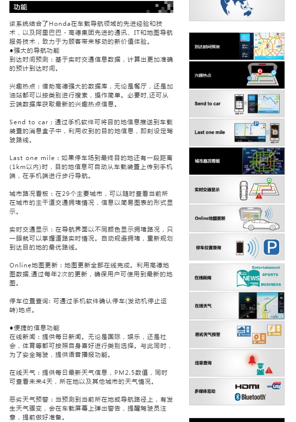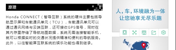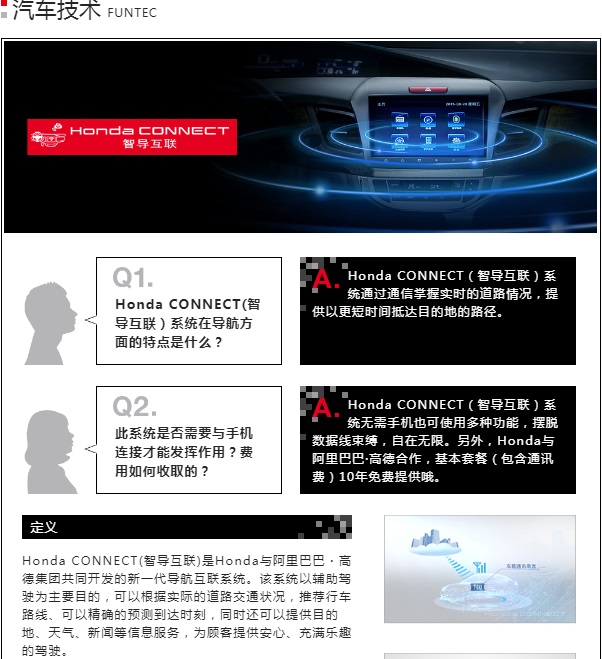 Honda CONNECT(智导互联)是Honda与阿里巴巴?高德集团共同开发的新一代导航互联系统。该系统以辅助驾驶为主要目的,可以根据实际的道路交通状况,推荐行车路线、可以精确的预测到达时刻,同时还可以提供目的地、天气、新闻等信息服务,为顾客提供安心、充满乐趣的驾驶。
