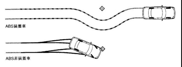 *ABS即汽车制动防抱死系统,在车辆紧急制动时,能实时调节制动力大小,防止侧滑和跑偏,提高汽车制动时的驾驶性能和车辆稳定性。在没有ABS时,如果紧急刹车