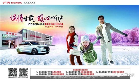 广汽本田安田店"温情廿载 暖心呵护 "冬季服务月感恩回馈活动倾情启动!在这个冬天,广汽本田安田店冬季关怀为您送出岁末暖暖关爱和丰厚的礼包回馈,给您更多的惊喜、更贴心的关怀!