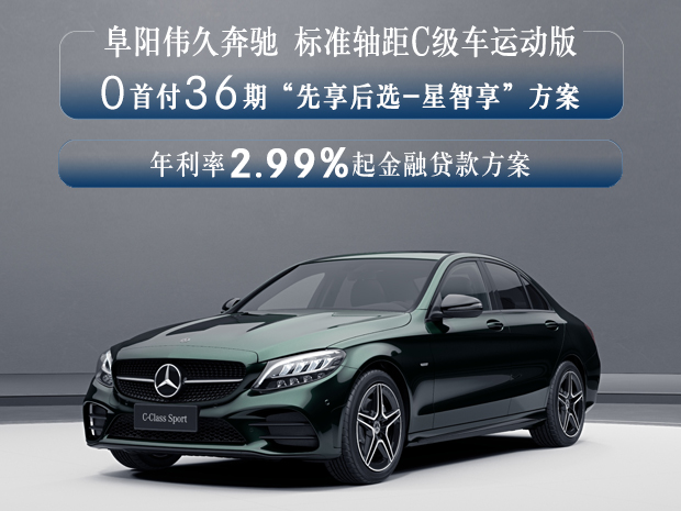 标准轴距C级车运动版限时购车新方案:可享限额7,000元/台重购置换保险支持;全系车型置换及重购支持,年利率2.99%起金融贷款方案;0首付36期“先享后选-星智享”方案。欢迎致电【阜阳伟久奔驰4S中心】网销热线:0558-3770777【1】购车尊享交车礼包 【2】置换送专属礼【3】奔驰金融超低息、低首付等多种贷款方式供您选择!【4】阜阳伟久奔驰可帮您办理临牌、上牌!网销团队全心全意期待您的来电!