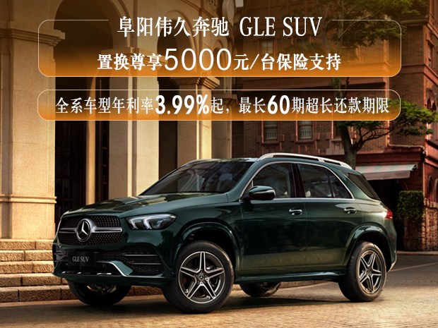 GLE SUV 限时购车新方案:全系年利率3.99%起,最长60期超长还款期限;置换尊享5,000元/台保险支持;重购客户尊享8,000元/台保险支持。欢迎致电【阜阳伟久奔驰4S中心】网销热线:0558-3770777【1】购车尊享交车礼包 【2】置换送专属礼【3】奔驰金融超低息、低首付等多种贷款方式供您选择!【4】阜阳伟久奔驰可帮您办理临牌、上牌!网销团队全心全意期待您的来电!