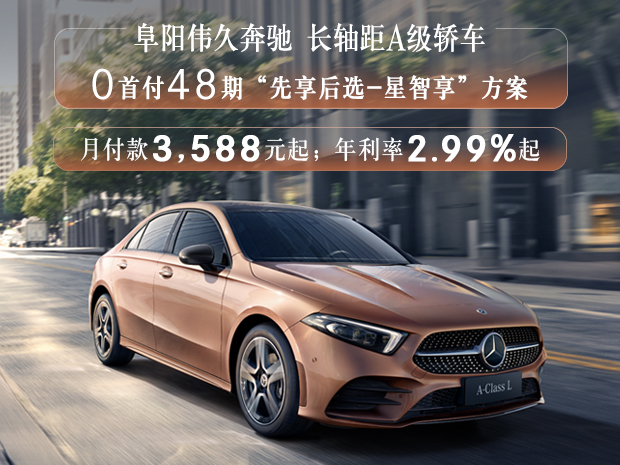 长轴距A级轿车 限时购车新方案:“先享后选-星智享”(0首付48期)方案,月付款人民币3,588元起;全系享5,000元/台重购置换保险支持;年利率2.99%起金融贷款方案;全新48期低月付款金融贷款方案。欢迎致电【阜阳伟久奔驰4S中心】网销热线:0558-3770777【1】购车尊享交车礼包 【2】置换送专属礼【3】奔驰金融超低息、低首付等多种贷款方式供您选择!【4】阜阳伟久奔驰可帮您办理临牌、上牌!网销团队全心全意期待您的来电!