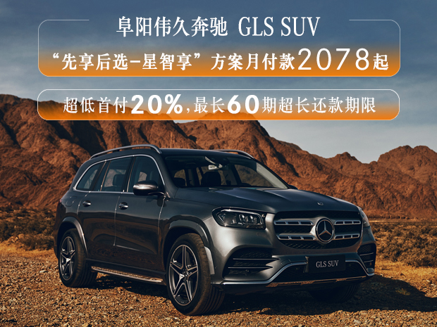 GLS SUV 限时购车新方案:可享限额8,000元/台重购置换保险支持;全系年利率6.49%起金融贷款方案,超低首付20%,最长60期超长还款期限;“先享后选-星智享”(高首付)方案月付款人民币2,708元起。欢迎致电【阜阳伟久奔驰4S中心】网销热线:0558-3770777【1】购车尊享交车礼包 【2】置换送专属礼【3】奔驰金融超低息、低首付等多种贷款方式供您选择!【4】阜阳伟久奔驰可帮您办理临牌、上牌!网销团队全心全意期待您的来电!