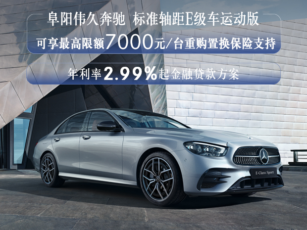 标准轴距E级车运动版 限时购车新方案:可享限额7,000元/台重购置换保险支持;全系车型置换及重购支持,年利率2.99%起金融贷款方案。欢迎致电【阜阳伟久奔驰4S中心】网销热线:0558-3770777【1】购车尊享交车礼包 【2】置换送专属礼【3】奔驰金融超低息、低首付等多种贷款方式供您选择!【4】阜阳伟久奔驰可帮您办理临牌、上牌!网销团队全心全意期待您的来电!