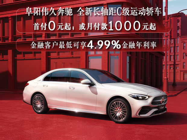 全新长轴距C级运动轿车限时购车新方案:金融客户最低可享4.99%金融年利率;“先享后选-星智享”方案,首付0元起;或月付款1000元起;全系车型置换或者重购支持。欢迎致电【阜阳伟久奔驰4S中心】网销热线:0558-3770777【1】购车尊享交车礼包 【2】置换送专属礼【3】奔驰金融超低息、低首付等多种贷款方式供您选择!【4】阜阳伟久奔驰可帮您办理临牌、上牌!网销团队全心全意期待您的来电!