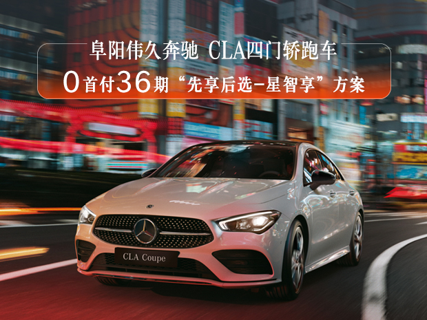 CLA四门轿跑车 限时购车新方案:“先享后选-星智享” (0首付36期)方案。欢迎致电【阜阳伟久奔驰4S中心】网销热线:0558-3770777【1】购车尊享交车礼包 【2】置换送专属礼【3】奔驰金融超低息、低首付等多种贷款方式供您选择!【4】阜阳伟久奔驰可帮您办理临牌、上牌!网销团队全心全意期待您的来电!