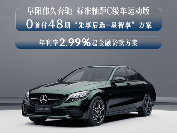 标准轴距C级车运动版限时购车新方案:金融客户最低可享2.99%金融年利率;48期0首付“星智享”方案;全系车型置换或者重购支持。欢迎致电【阜阳伟久奔驰4S中心】网销热线:0558-3770777【1】购车尊享交车礼包 【2】置换送专属礼【3】奔驰金融超低息、低首付等多种贷款方式供您选择!【4】阜阳伟久奔驰可帮您办理临牌、上牌!网销团队全心全意期待您的来电!