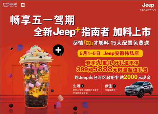 【安】畅享五一驾期 全新Jeep+指南者加料上市【徽】尊享九重礼 好礼送不停【伟】进店抽奖,399元购5888元限量超值大礼包【弘】购Jeep车包河区政府补贴2000元现金【Jeep】更有机会赢取10000元购车补贴,49999元旅行大礼包【店】活动时间5月1-5日,Jeep安徽伟弘店