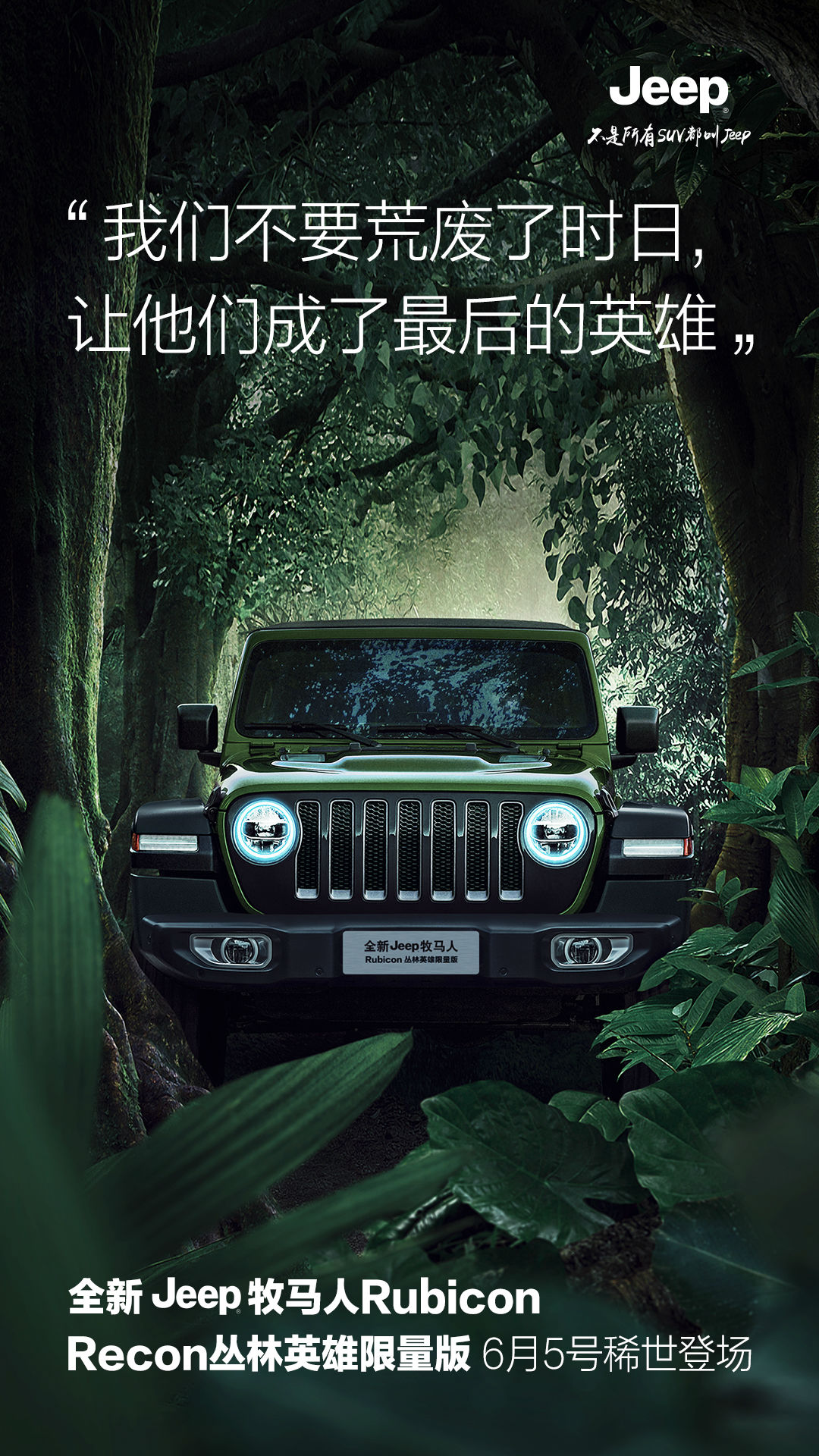 水覆盖着这个星球的75%,而剩下的25%由牧马人覆盖,全新Jeep牧马人Rubicon Recon丛林英雄限量版6月5日即将稀世登场,专属亚马逊丛林绿,让你的每一次经历都是一段人生传奇。