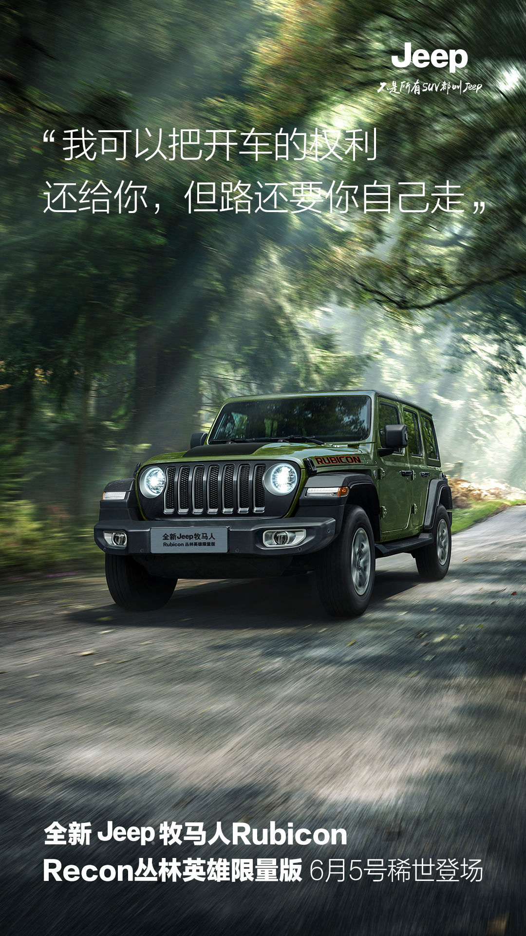 水覆盖着这个星球的75%,而剩下的25%由牧马人覆盖,全新Jeep牧马人Rubicon Recon丛林英雄限量版6月5日即将稀世登场,专属亚马逊丛林绿,让你的每一次经历都是一段人生传奇。