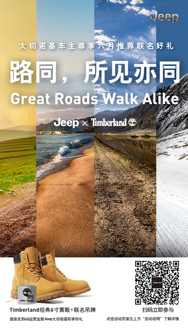 全新进口Jeep大切诺基,即日起至本月底到店看车即有机会获得Jeep与Timberland联名礼盒(含一双Timberland经典6寸黄靴和一个定制联名吊牌)。