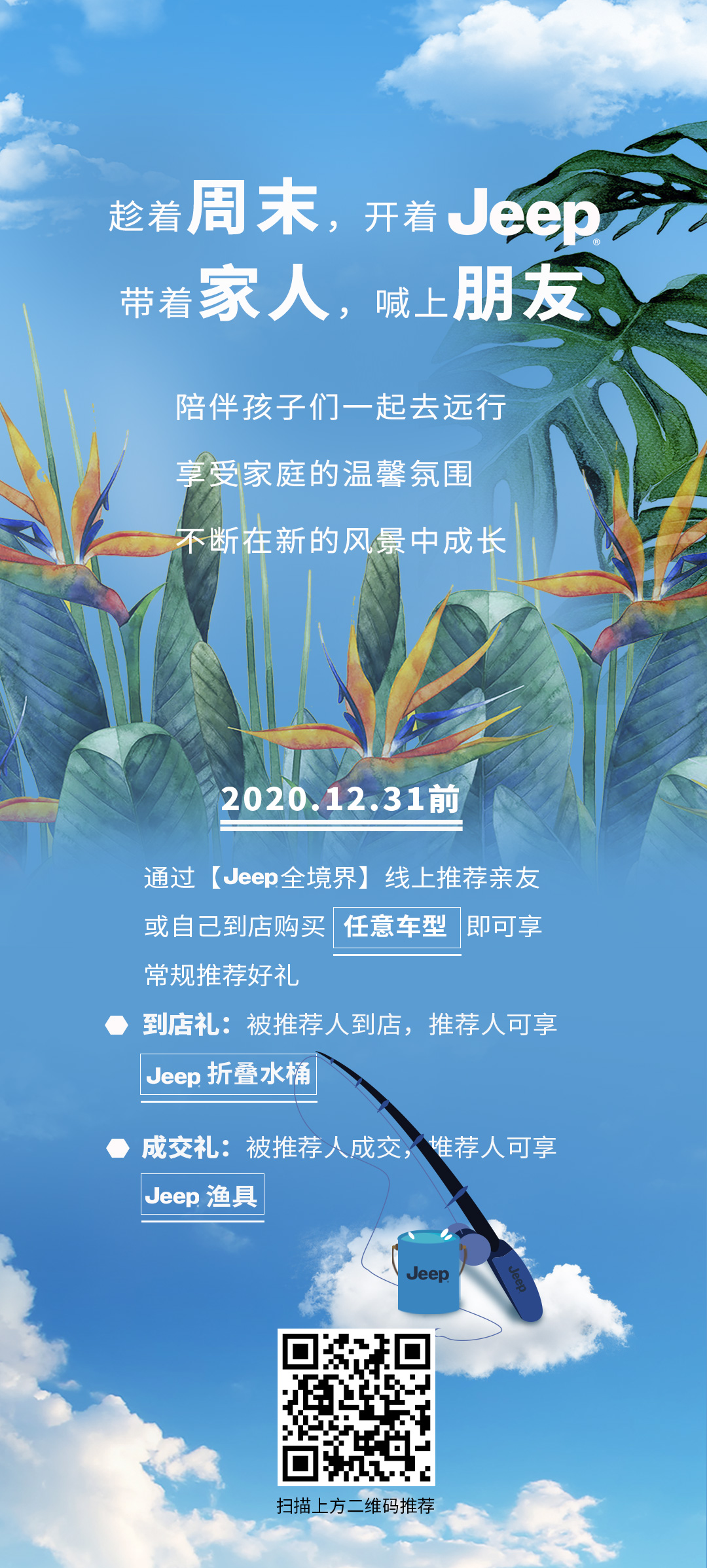 趁着周末,开着Jeep,带着家人,喊上朋友一起去远行!Jeep好礼相守!