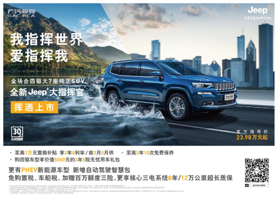 全场合四驱大7座纯正SUV的全新Jeep+大指挥官与超效新能源实力的全新Jeep大指挥官PHEV的同时加料上市,将令大指挥官家族的产品实力得到更进一步加强,并使Jeep大指挥官家族继续成为中大型高端SUV实力双标杆。79年历史的Jeep品牌将始终以强大的全路况实力, 激发不满足于平淡生活的人们去探享极富激情和感召力的生活方式。Jeeper们指挥着关于探索、自由和未知的精彩世界,对于家人、生活与事业的所有热爱则指挥Jeeper,而不管你们在哪里,Jeep会一直在人们背后,全力支持你的一切梦想。