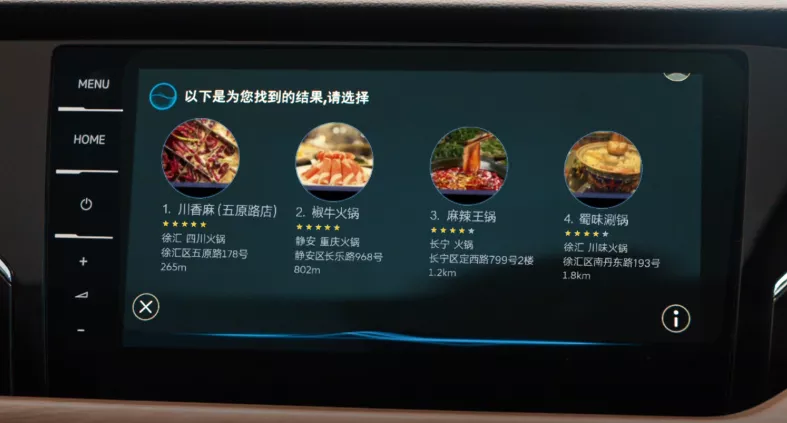 更为先进的是,智慧车联系统依托大数据分析技术,根据用户的使用习惯,可以预测用户的目的地,比如早上出门,多半是上班路线,下班后多半是回家路线,精准推送智能出行路线。不仅如此,用户可以随时通过语音控制喊出自己的出行需求,比如我想去加油站,我想吃火锅,导航会自动推荐合适的目的地以供用户选择。