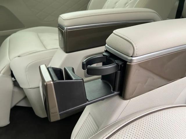 两个独立座椅采用的是带有菱形缝线打孔的真皮材质,应该是说每个座椅都是如此。内侧是固定扶手,还能弹出杯架,相当有仪式感。其次在独立座椅上还配备了宾利同款头枕,并且可以向中间收拢,让头部处于最舒适的位置。下面还设有电动腿托,坐在上面你会感觉到身体的每一处都被软皮所支撑着。当然,在这样的头等舱座椅上,座椅加热通风等都是应有尽有。另外还提供了两种模式的按摩功能。
