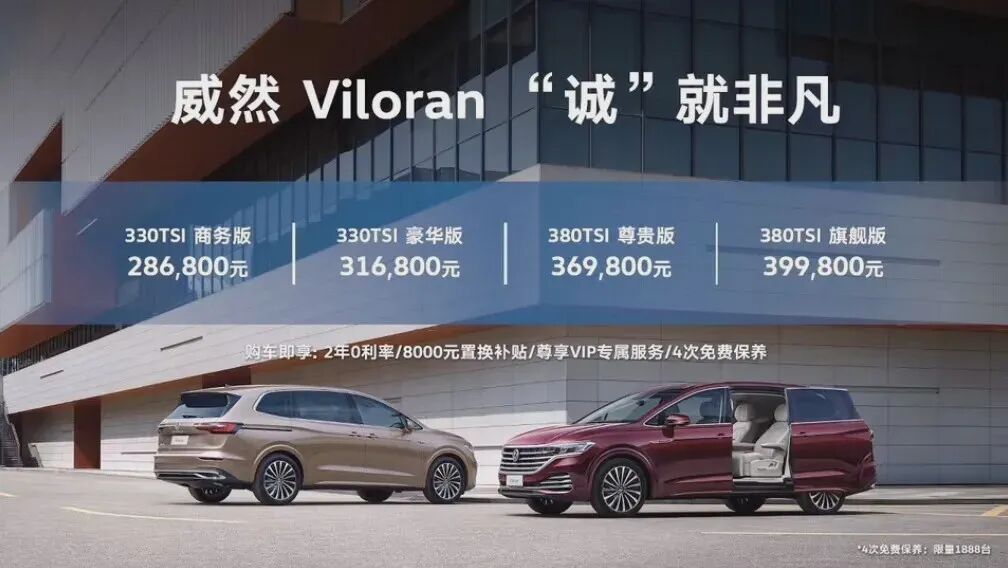 5月28日,上汽大众首款大型豪华商务MPV威然Viloran正式上市,推出330TSI和380TSI两种动力的四款车型,售价区间28.68万-39.98万元,并提供2年0利率、8000元置换补贴等优惠购车政策。流线的车身是威然Viloran与传统MPV“方盒子”造型最直观的不同,颇为流畅的车身线条让整车更符合大部分消费者的审美。威然Viloran是由上汽大众为主导,为全球市场开发的车型。也就是说,虽然威然Viloran率先在中国市场上市,但是其未来也有希望进入美国或者欧洲市场。另外,车身尺寸也是威然Viloran的一大优势,新车长宽高分别达到了5346/1976/1781mm,轴距达到了3180mm。在车身大小上已经超越了别克GL8,是目前同级MPV市场中尺寸最大的车型之一。本次上市的四款车型全都采用了2+2+3的座椅布局,但作为一款行政级座驾,第二排才是重中之重。威然Viloran第二排礼宾座椅采用高档的真皮打孔座椅,优雅的菱形格纹理,辅以滚边与绗缝工艺,体现精致与档次感。座椅集电动调节(靠背及腿托)、主动通风功能、加热功能于一身,更有3种模式x3种档位气动按摩功能,为二排贵宾带来尊享体验。此外,威然Viloran还配备智能双侧防夹电动门和智动行李厢背门(带位置记忆功能),展现出大V超越同级的待客之道。另外,威然Viloran的内饰整体整体还是大众的风格,简约之中也透露着大气的现代美学。仪表台层次丰富,采用了三种材质的装饰,营造出精致、豪华与活力相结合的效果,搭配10.25”全数字液晶仪表和9.2”高级智能多媒体交互系统,带来全新数字视觉享受。多层次的设计延续至门护板,辅以菱形格纹理皮革搭配双缝线,打开车门即能感到豪华气息扑面而来。不仅如此,威然Viloran豪华定制的长绒礼宾地毯,柔软丰满,脚感舒适,增强车内美观舒适度的同时,更有吸音、隔热、防滑等作用。此外,十色内饰氛围灯的运用也在夜晚时营造舒适浪漫的车内情调。智能科技方面,Viloran也身手不凡。Viloran搭载智慧车联系统,为用户提供语音、导航、控车、娱乐、出行等全方面的车联体验。此外,Viloran拥有Traffic Jam Assist交通拥堵辅助系统、Lane Assist车道保持系统、ACC3.0第三代的自适应巡航系统、AEB城市紧急制动带毫米波前雷达行人横穿识别、Side Assist变道辅助系统、PLA3.0全方位智能泊车辅助系统等多项领先驾辅科技。符合中国路况需求的L2级别智能驾驶黑科技,辅以前瞻数字视野驾舱,为大V升级主动安全防护,轻松应对中国城市复杂的路况。