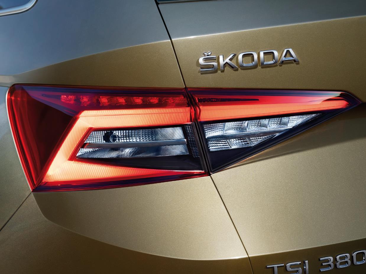 在车辆后方,两侧的冰晶三维C形LED尾灯同样令人过目难忘。见棱见角的线条勾勒出漂亮的三维立体型面,彰显着水晶切割的设计理念。造型上保持了斯柯达标志性的C形样式,极具品牌辨识度,在茫茫车流中轻易脱颖而出。