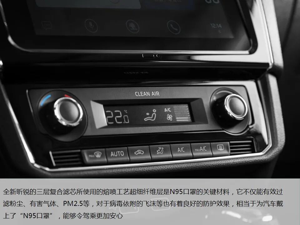 疫情之下,健康的座舱环境至关重要。全新斯柯达昕锐严格控制车内VOC等有害物质的含量,充分保证乘员乘车健康。值得一提的是,全新昕锐全系标配带Clean Air功能的空调系统,其搭载的三层复合滤芯通过了CN95认证,该认证是由中汽研华诚认证中心认证的最高级别的空滤,其防护效果堪比“N95口罩”。