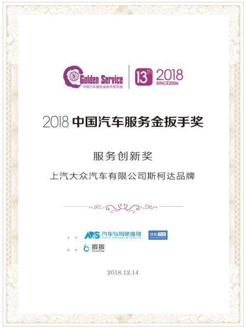 凭借在售后服务模式上的创新,斯柯达还在“2018中国汽车服务金扳手奖评选”中荣获了合资品牌组“服务创新奖”,这已是其连续十二年在该评选中载誉而归。