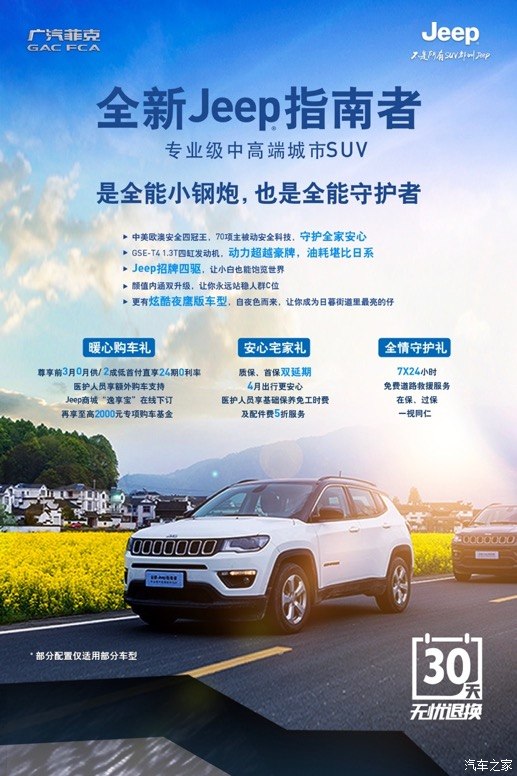 *“暖心购车礼”:活动截止至2020年2月29日,其中“2成低首付,直享24期0利率”仅限全新Jeep指南者车型及200T典尚版车型,最终可享受的利率政策以金融机构审核结果为准;“逸享宝”活动截止至2020年3月31日,Jeep全系车型可享