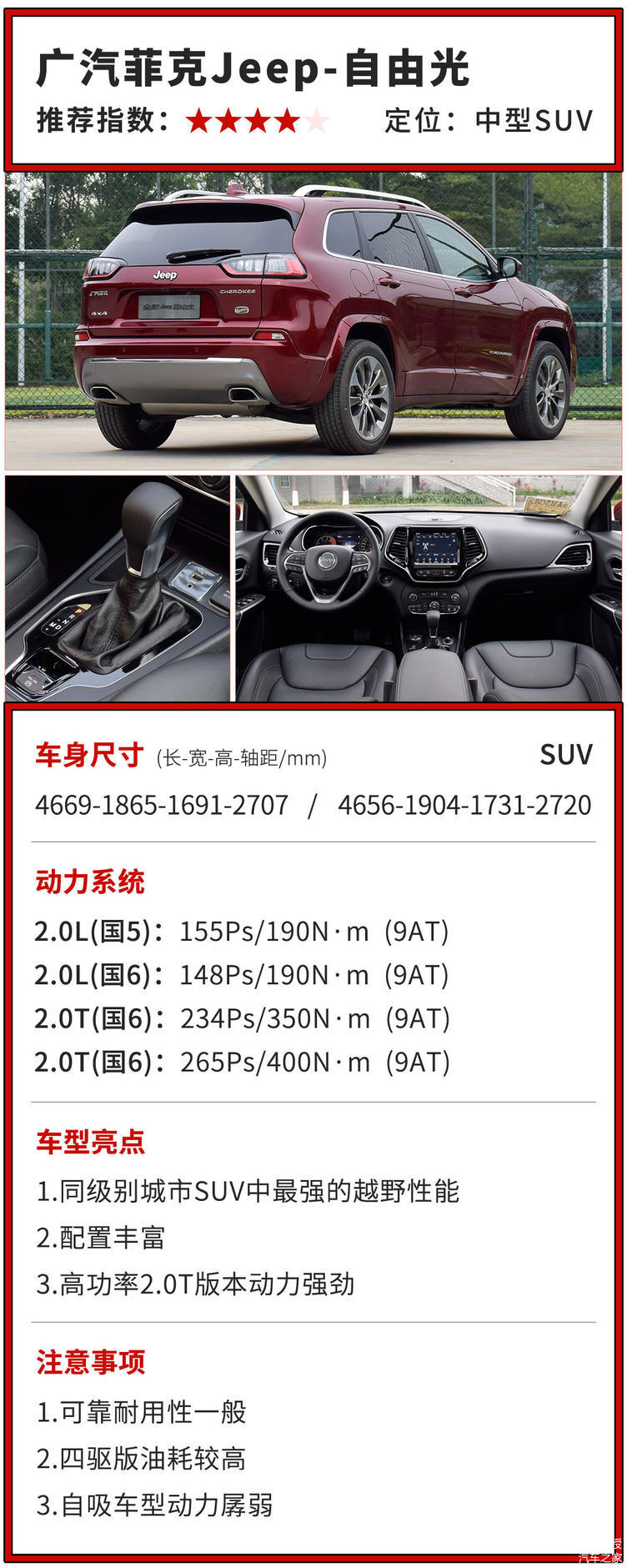 自由光2.0T车型的引擎也值得一提,这台引擎由母公司菲*特-克*斯勒集团研发,应用于旗下品牌的众多车型,比如阿尔法·罗密欧Giu*i*。在自由光上,这台引擎有234和265马力两种调校,无论是与老款的2.4自吸引擎,还是与其它同级别城市SUV的2.0T引擎相比,动力都是非常强劲的,是玩沙子、冲坡、攀爬的好帮手。至于2.0自吸版本,大家就忘了吧,教授也不建议大家买,动力实在太弱,预算紧张还不如降级去买1.3T的指南者算了。