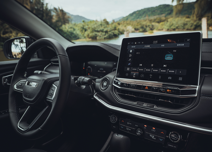 坐进新款Jeep指南者的车内,它的整体内饰布局有了很大改变,中控台、仪表以及换挡杆的周边都经过了全新的设计,并且装潢的黑色饰板也采用了大量的软性材料和皮质包裹。最值得一提的是,全新样式的中控屏幕和内置系统,让这台新车走在了同级标准的前沿。Jeep新指南者配备10.25英寸全液晶仪表盘。另有10.1英寸中控屏,处理器性能及容量均大幅提升。同时搭载全新腾讯TAI 3.0汽车智能系统,智能语音交互管家——叮当助手,智享更人性化更专属的配置体验。