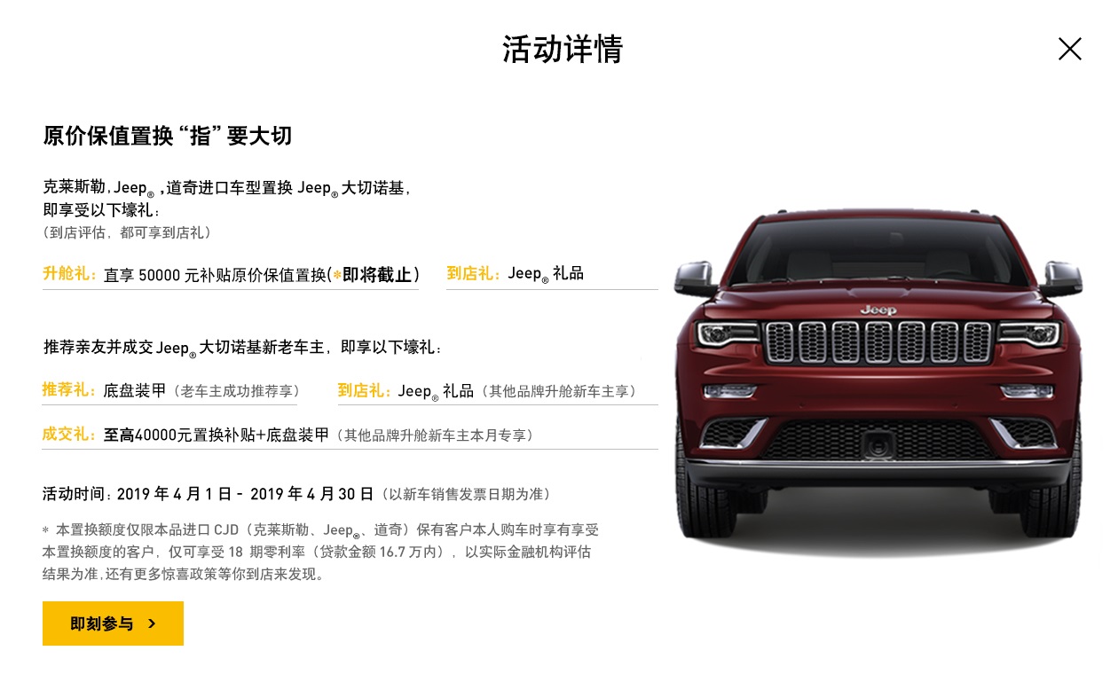 进口Jeeper 50000元的置换现金补贴活动即将截止,梦想窗口期不到15天;进口Jeep大切诺基史上至高的其他品牌升舱现金补贴已经开启!